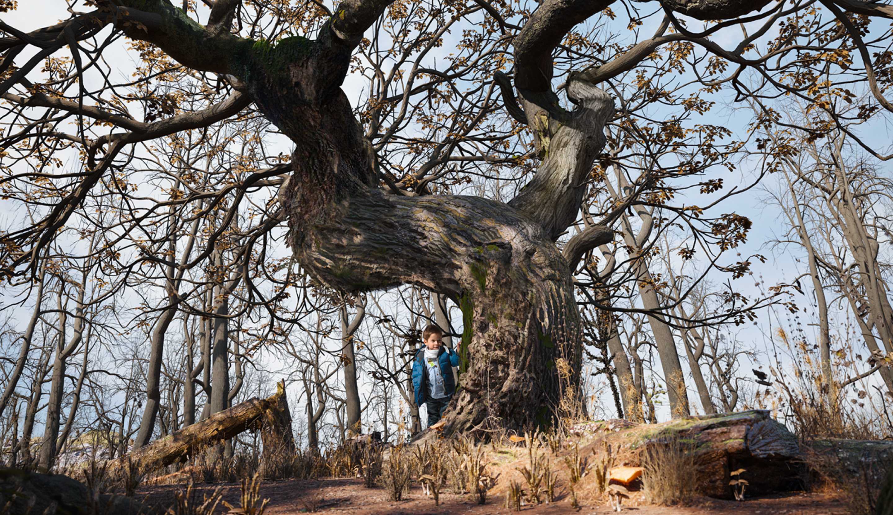 - Texturing was an important step. To mimic real trees, where newer bark appears softer and less deformed, I created an invisible mesh that surrounds the tree. This mesh blends between two textures based on its distance to the tree. One texture aggressively displaces the surface and gives a dry appearance, while the second texture is softer and slightly greener in tone.